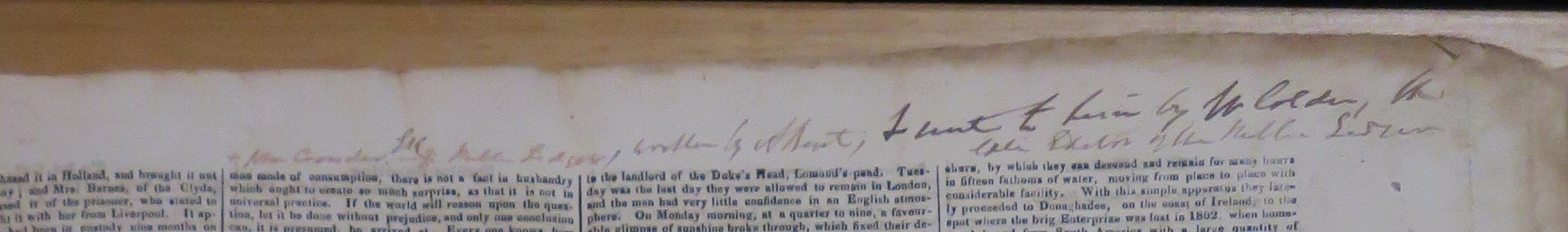 The newspaper volumes Bent took with him to New South Wales had experienced, like their owner, a life of vicissitudes. In asserting that they were quite complete and in perfect preservation, he was being a little loose with the truth. The early volumes in particular are battered, stained and torn (sometimes at critical places). From 1824 they had been much scribbled upon, not to mention at least one mishap with a cup of tea or coffee.