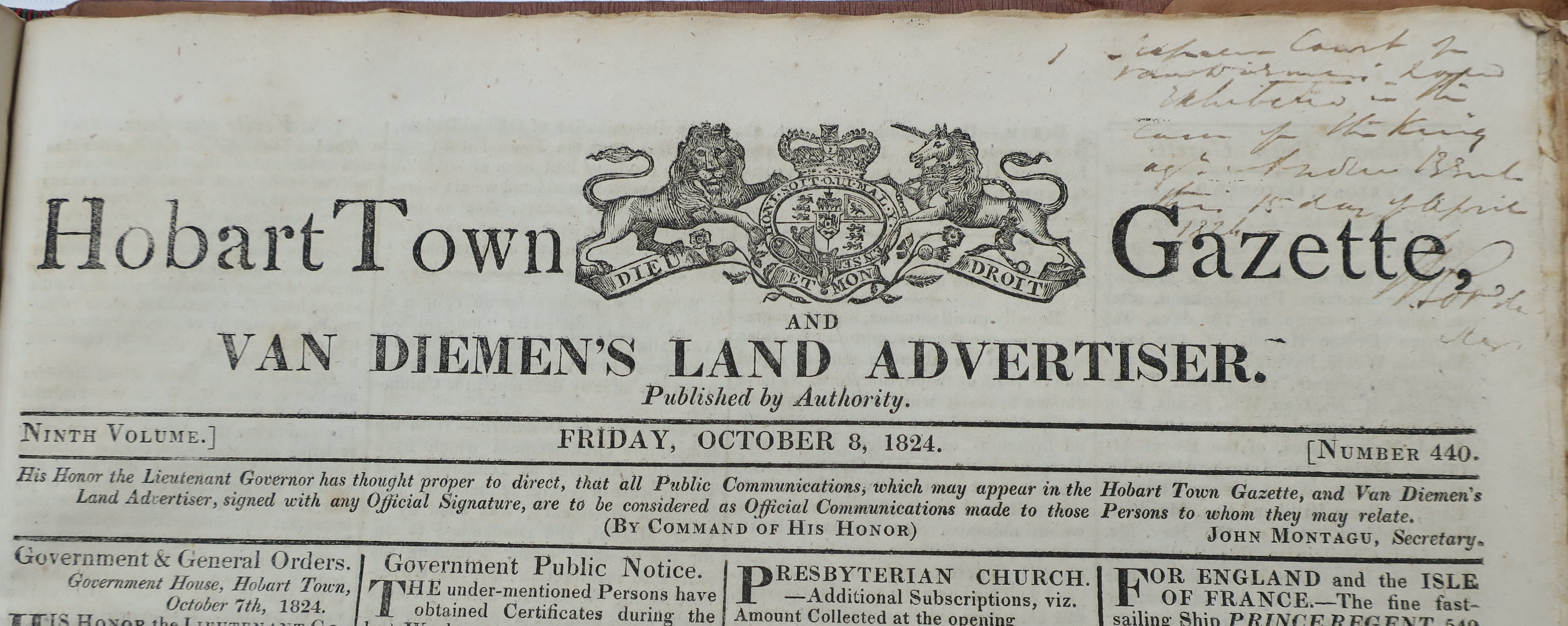 Bent sold his set of the Hobart Town Gazette and Colonial Times to the Van Diemen’s Land government in 1849. Some of these fifteen volumes (1829 was not included) have since become scattered but most survive – 1816-18 are in the National Library of Australia; 1819, 1821-23, 1825-6, 1828 and 1830-31 remain in Hobart and 1824 is in the Mitchell Library. The annotated issues of the Gazette for 1825 and Colonial Times for 1825-6 and 1828 can be viewed on Trove. A note in Bent’s hand in the 1828 volume can be seen on the microfilm version, but is not viewable on Trove