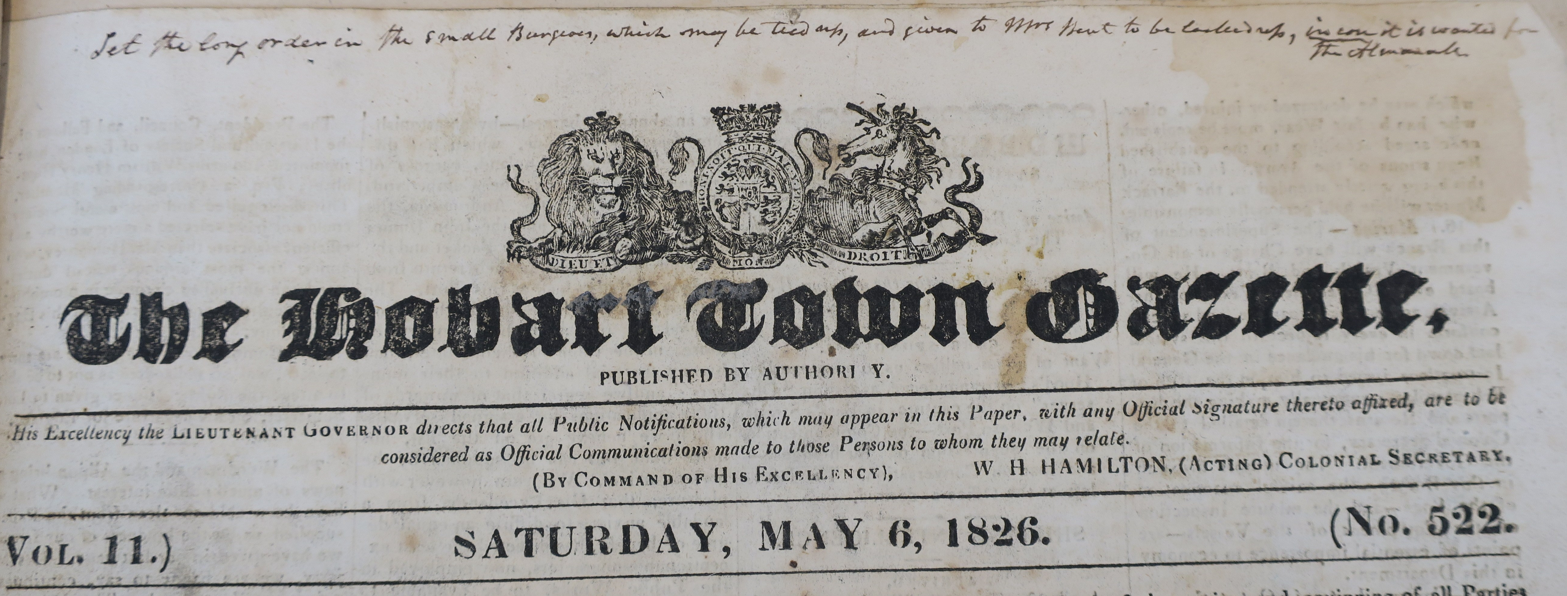 - The official Ross/Howe Hobart Town Gazette for 1825 (in private collection) and 1826 (National Library of Australia)