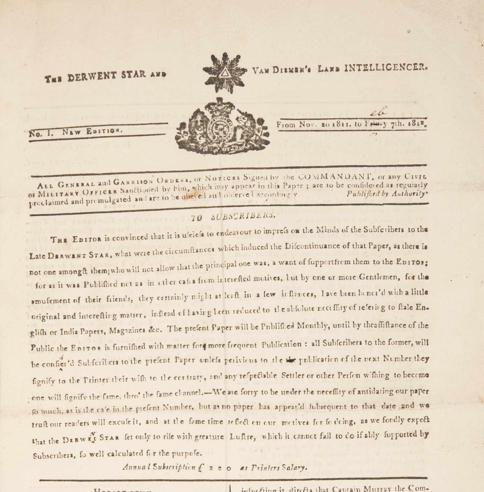 - Masthead: No. 1. New edition (from Nov. 20, 1811 to Friday [crossed out and Feb written in pen] 7th 1812.