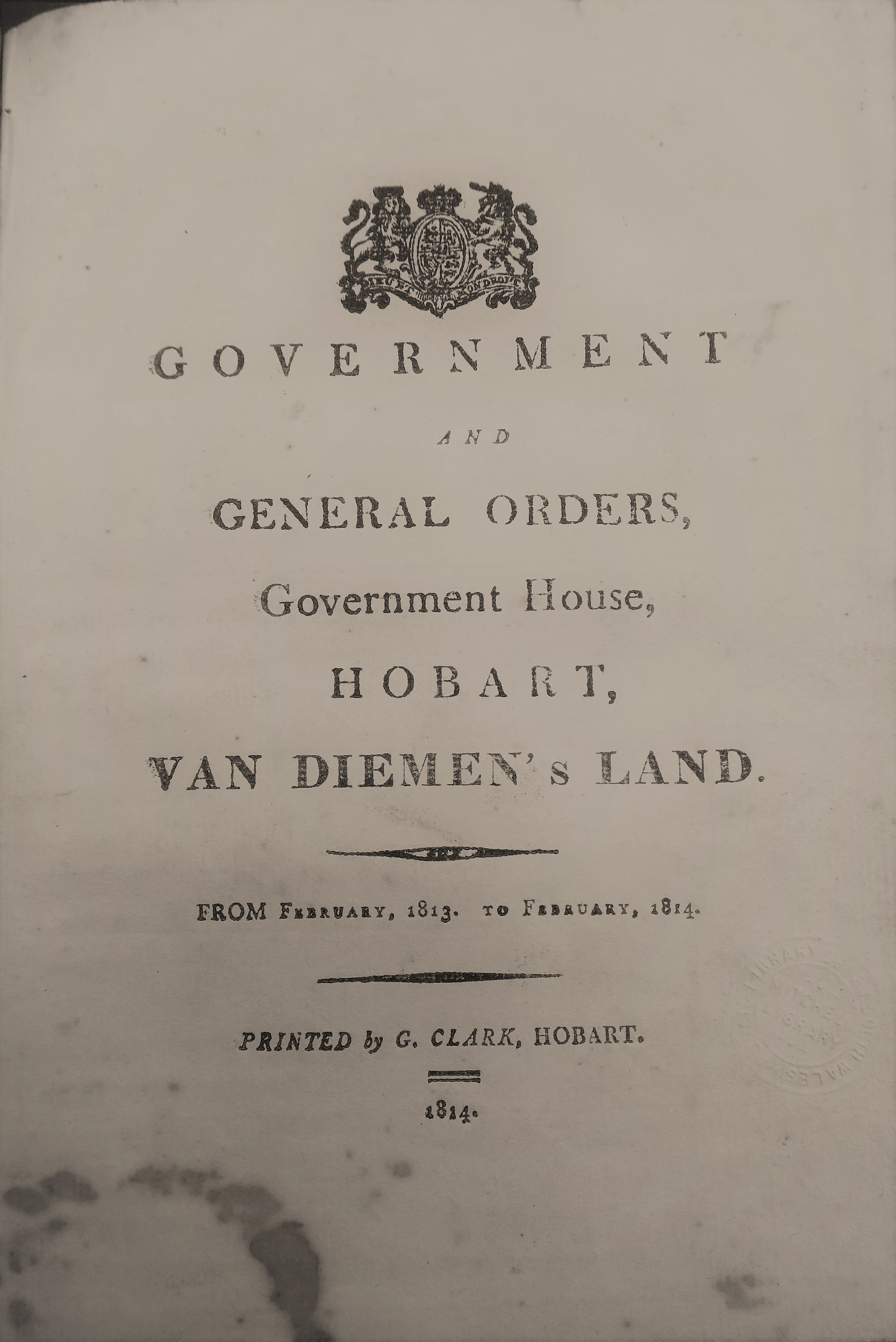 In February 1813 Thomas Davey arrived as the new Lieutenant Governor. About a year later Clark printed a 36-page compilation of orders and proclamations issued during his first year in office. The only known copy, in the Mitchell Library, is bound with other items in a volume inscribed by Davey’s son in law, James Scott. The last order included is dated February 1814, so it was probably printed around that time. Clark is not designated Government Printer so it is not clear whether this pamphlet was an official government publication or a private commercial venture. All the notices in it would have been originally printed by Clark.