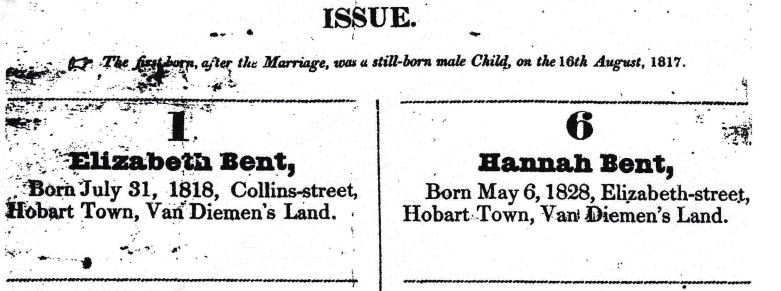 Elizabeth was born in Collins Street, Hobart Town, on 31 July 1818, and was baptised by the Rev. Robert Knopwood on Sunday 13 September. According to Knopwood’s diary, the morning was ‘so cold DV service could not be performed’. If the parson took a drop of something to warm up it might explain why Elizabeth’s parents were recorded as ELLIS and Mary Bent, Ellis Bent being the former deputy judge advocate in Sydney, and already dead. There is no doubt, though, that the baptism was that of Elizabeth, as the 1819 muster records Andrew Bent as having one child. Bent himself provides the details in a printed list of his family from the 1830s.