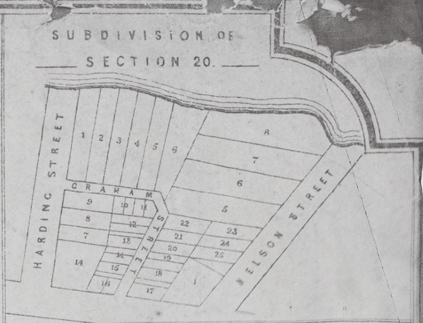 Plan of the city of Auckland 1865. (Auckland Libraries). Electoral rolls show Warner in occupation of blocks 9 and 10, Section 20. A detailed view of this area is in the inset, top right, and reproduced below