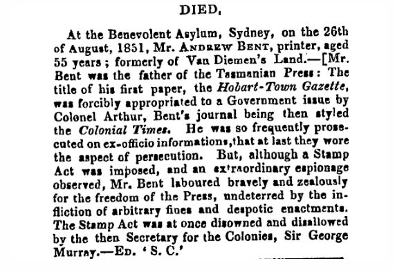 Although much of Elizabeth’s life can in large part be imagined only through the lens of her better-known husband, one thing becomes very clear. She and her family kept Andrew Bent’s name and legacy burning bright. A little over a year after Elizabeth’s arrival in Auckland a notice of Bent’s death appeared in the newspaper with editorial remarks which could only have come via Elizabeth or her husband. No newspaper in the Australian colonies provided such an obituary.