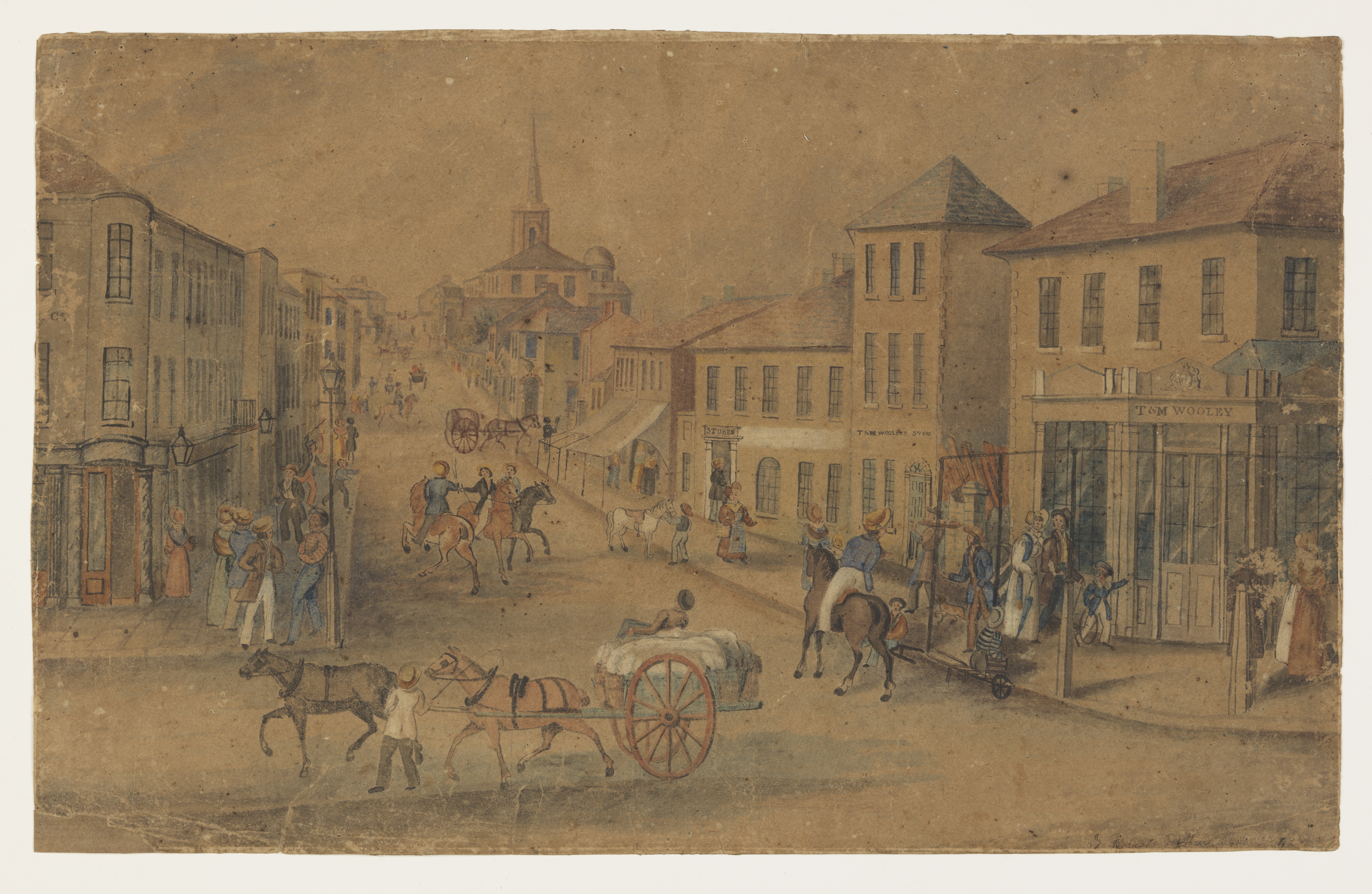 A bustling street scene in Sydney, ca. 1842, showing the church where Elizabeth witnessed the marriage of her sister Catherine. George Roberts. King Street towards St. James’s Church (State Library of NSW V/328 https://collection.sl.nsw.gov.au/record/npANQdl1)
