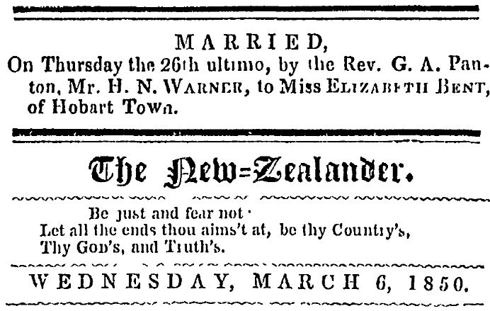 We have to record the death of the wife of Mr H. N. Warner, of Grahame-street, a very old resident of Auckland, who died on Monday in her 81st year. The deceased lady had been in Auckland since 1850, her husband having arrived in 1840. Mrs. Warner was the eldest daughter of the late Mr. Andrew Bent, the father of the Tasmanian press. She had been in failing health for the last six months, and at last succumbed to dropsy, bearing her sufferings with great resignation … Mrs. Warner had been a member of the Beresford-street Church (formerly the Congregational Church in Albert-street) ever since her arrival in Auckland. (NZH 26 December 1900)