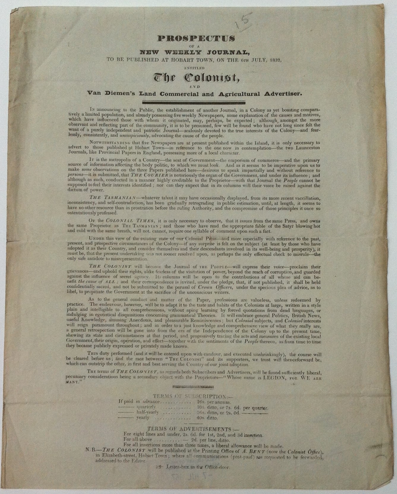 Prospectus of a new weekly Journal to be published at Hobart Town, on the 6th July 1832 entitled the Colonist, and Van Diemen’s Land Commercial and Agricultural Advertiser.