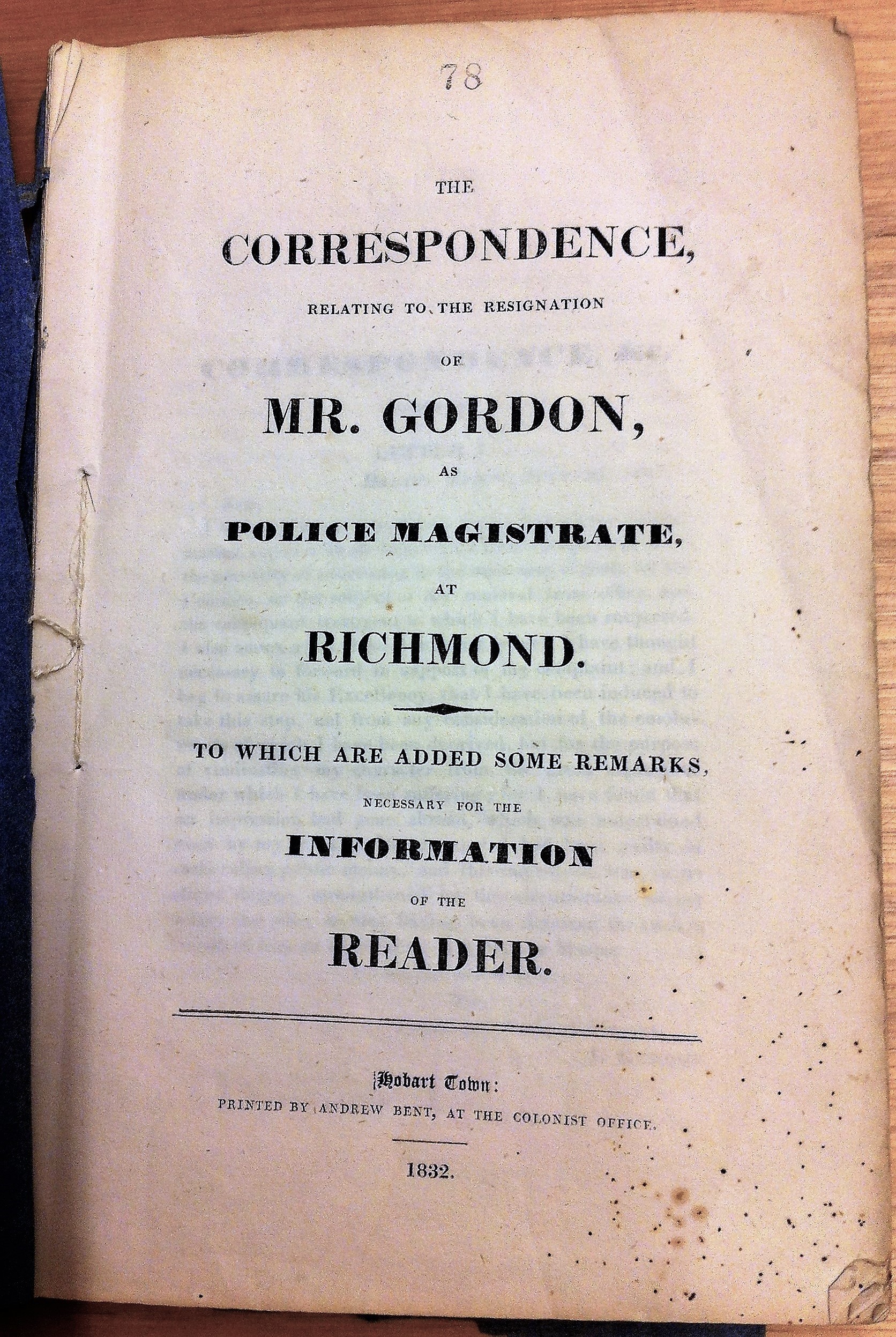 The Correspondence, relating to the Resignation of Mr. Gordon, as Police Magistrate, at Richmond. To which are added some Remarks necessary for the Information of the Reader. Hobart Town: Printed by Andrew Bent at the Colonist Office. 1832.