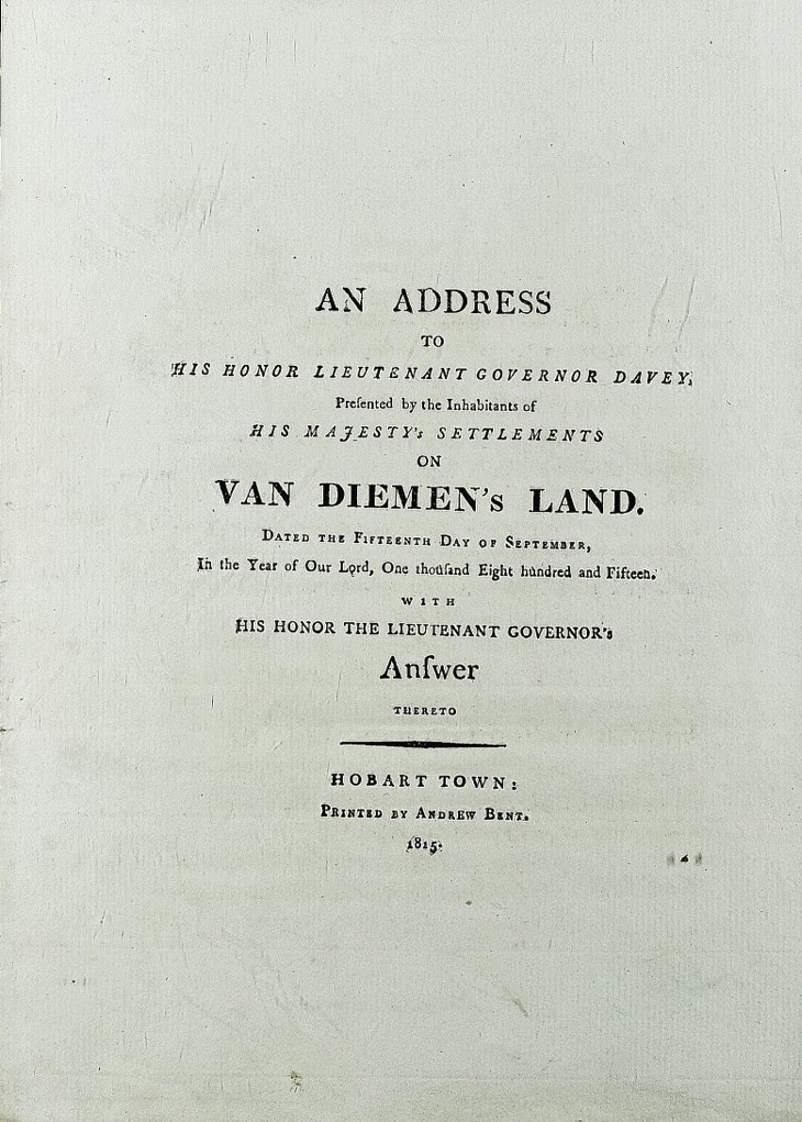 Copy of an Address to His Honor Lieutenant Governor Davey, received from the Inhabitants of His Majesty’s Settlements on Van Diemen’s Land. Dated the fifteenth day of September, in the year of Our Lord, one thousand eight hundred and fifteen. With His Honor the Lieutenant Governor’s Answer thereto. Hobart Town: Printed by Andrew Bent. 1815.