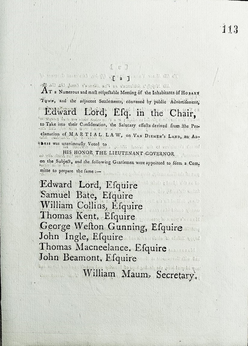 By April 1815 the bush-ranger problem was so dire that Davey desperately (and illegally) declared martial law. The address was drawn up on 17 August at what Rev. Knopwood described as ‘a great meeting of all the officers,’ convened by public advertisement and chaired by Edward Lord. It congratulated Davey on his firm, wise and energetic measures and prayed for the continuance of martial law and for a local criminal court. Around 500 free men signed, so despite a few documented refusals, the address had all the appearance of a spontaneous outpouring of public support. It is not clear whether Bent printed the address for the committee, or at Davey’s behest. He is not designated Government Printer in the imprint. By this time Davey knew his days as Governor were numbered and, anxious to defend himself against mounting criticism from Governor in Chief Macquarie, began sending despatches directly to the Colonial Office. He may have orchestrated the whole exercise. Either way the address was a very useful document for Davey.