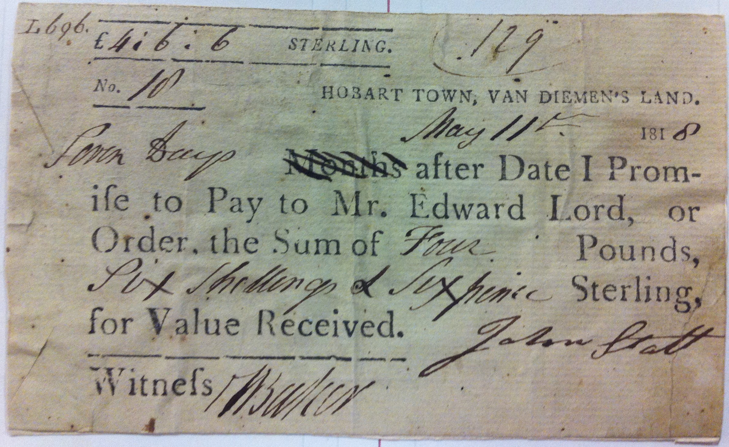 Another example possibly as item 1 from Lot 127 at Clifford Craig sale. Printed promissory note. Wm. Blyth promises to pay Mr Edward Lord £40, dated 31 May 1819. Current whereabouts unknown.