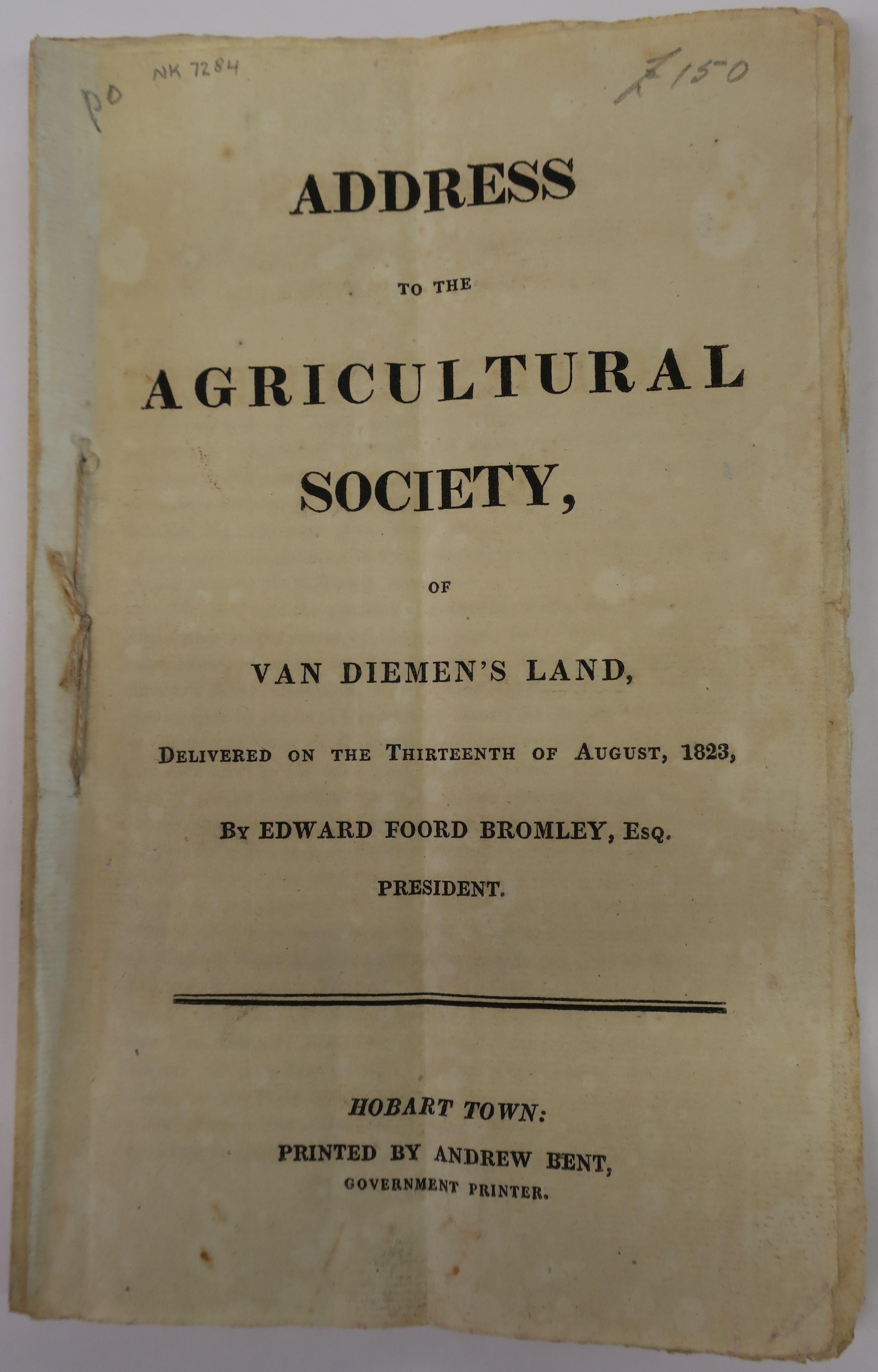 Bromley, Edward Foord. Address to the Agricultural Society, of Van Diemen’s Land, delivered on the thirteenth of August, 1823, by Edward Foord Bromley, Esq. President. Hobart Town: Printed by Andrew Bent. Government Printer.