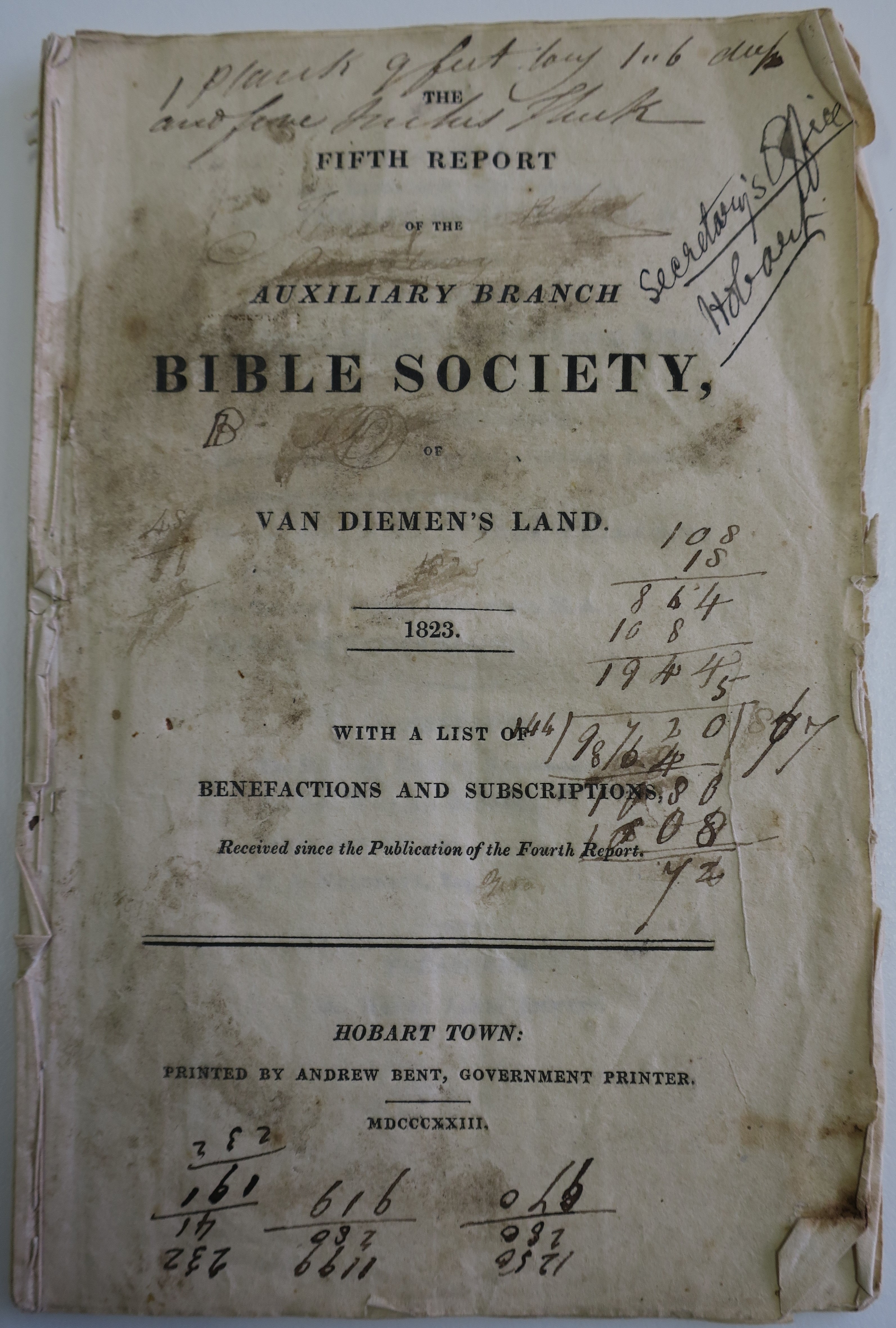 The fifth Report of the Auxiliary Branch Bible Society of Van Diemen’s Land. 1823. With a list of Benefactions and Subscriptions, received since the Publication of the fourth Report. Hobart Town: Printed by Andrew Bent, Government Printer. MDCCCXXIII.