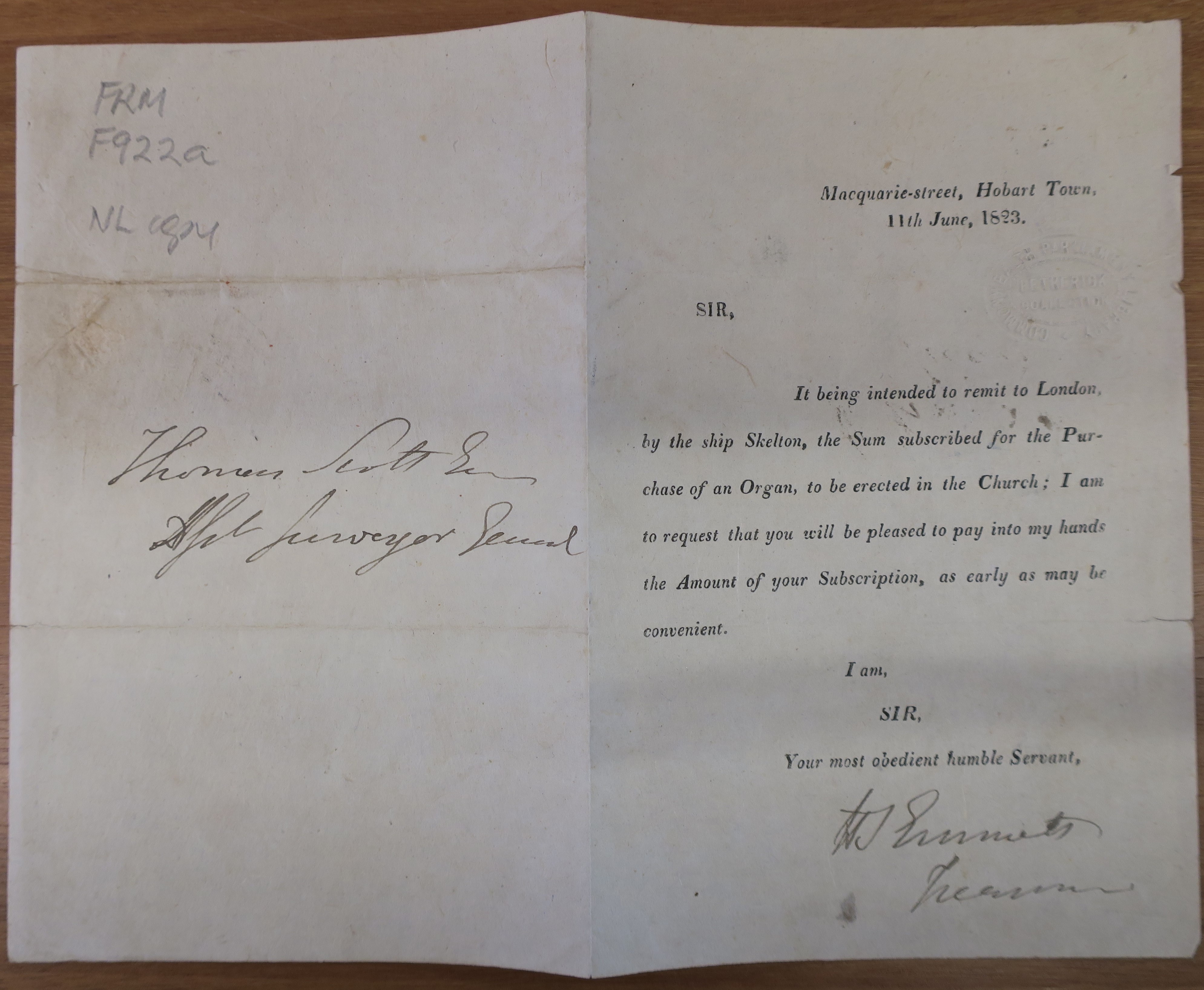 [Circular letter, 11th June, 1823, regarding subscriptions for the purchase of an organ for St. David’s Church]