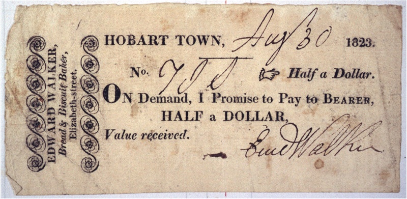 Edward Walker, Bread & Biscuit Baker, Elizabeth Street, Half a dollar. Printed 1823. Written 30 Aug. 1823. 58 X 122 mm.