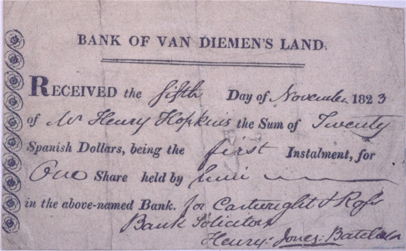 [Receipt of the Bank of Van Diemen’s Land for payment in Spanish dollars for share issues] 1823