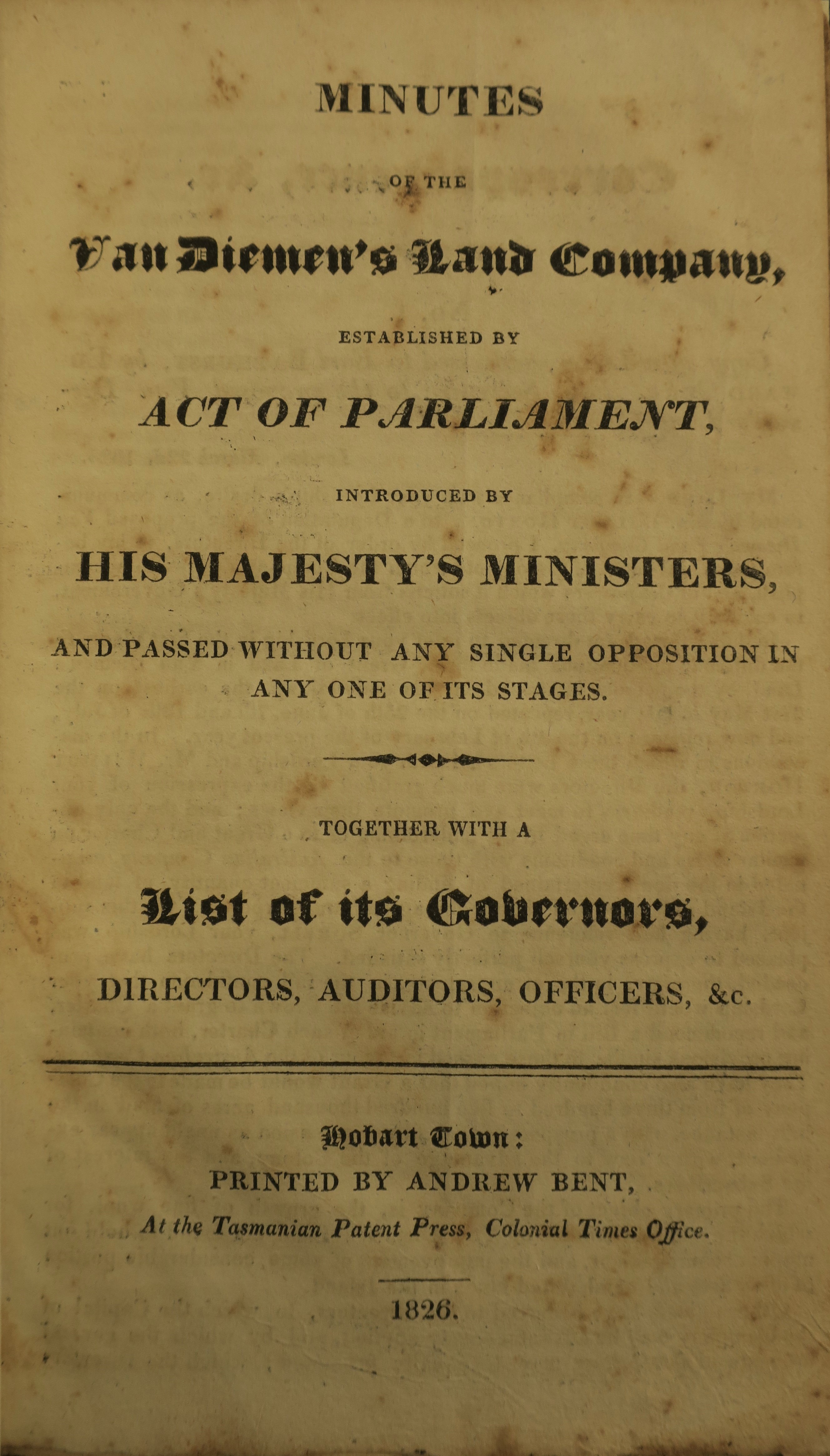 Minutes of the Van Diemen’s Land Company, established by an Act of Parliament, introduced by His Majesty’s Ministers and passed without any single Opposition in any one of its Stages. Together with a List of its Governors, Directors, Auditors, Officers, &c. Hobart Town: Printed by Andrew Bent, at the Tasmanian Patent Press, Colonial Times Office, 1826.