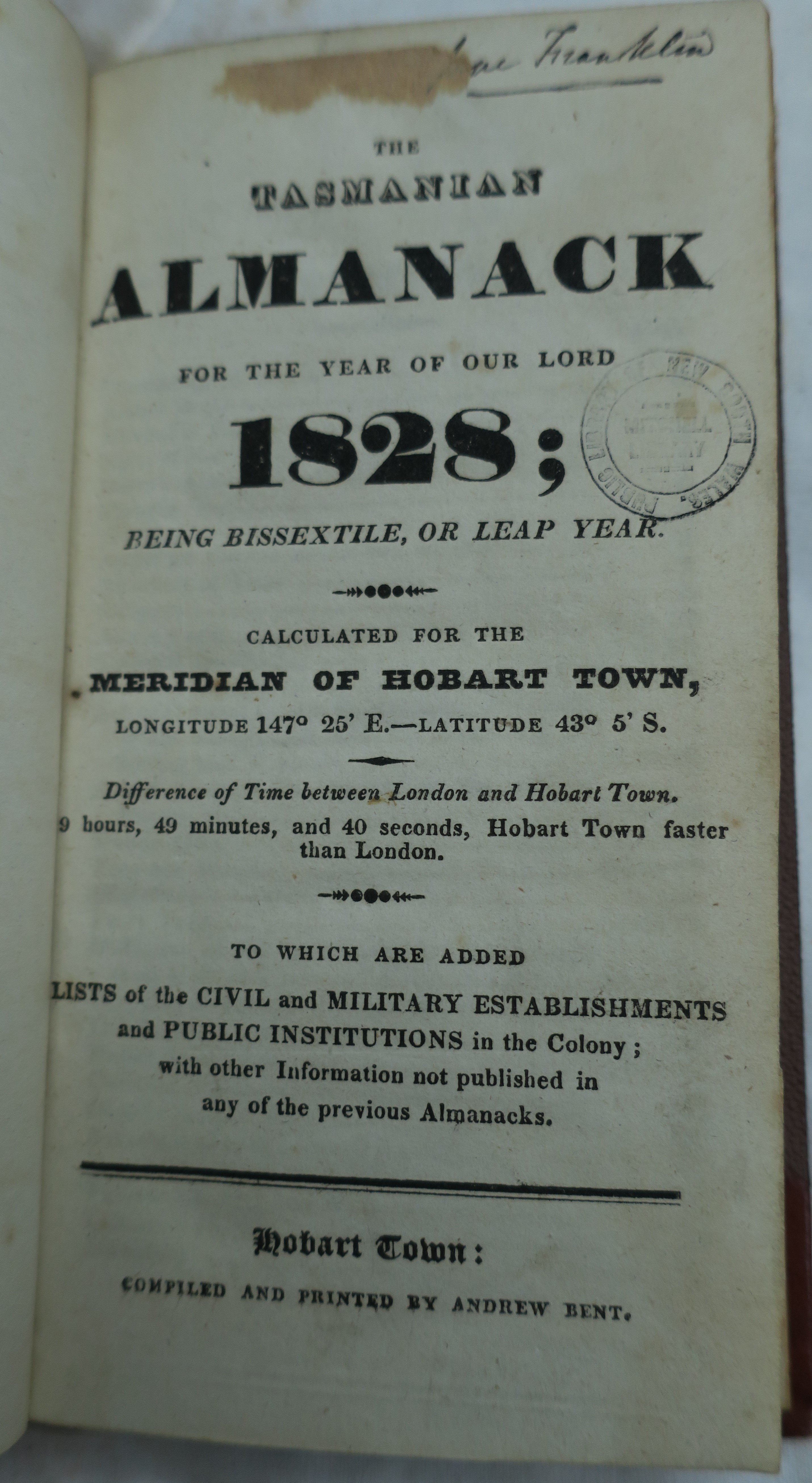The Tasmanian Almanack for the Year of our Lord 1828; being Bissextile, or Leap Year. Calculated for the Meridian of Hobart Town, Longitude 147° 25′ E.—Latitude 43° 50’ S. Difference of Time between London and Hobart Town, 9 hours, 49 minutes, and 40 seconds, Hobart Town faster than London. To which are added Lists of the Civil and Military Establishments and Public Institutions in the Colony; with other Information not published in any of the previous Almanacks. Hobart Town: Compiled and printed by Andrew Bent.