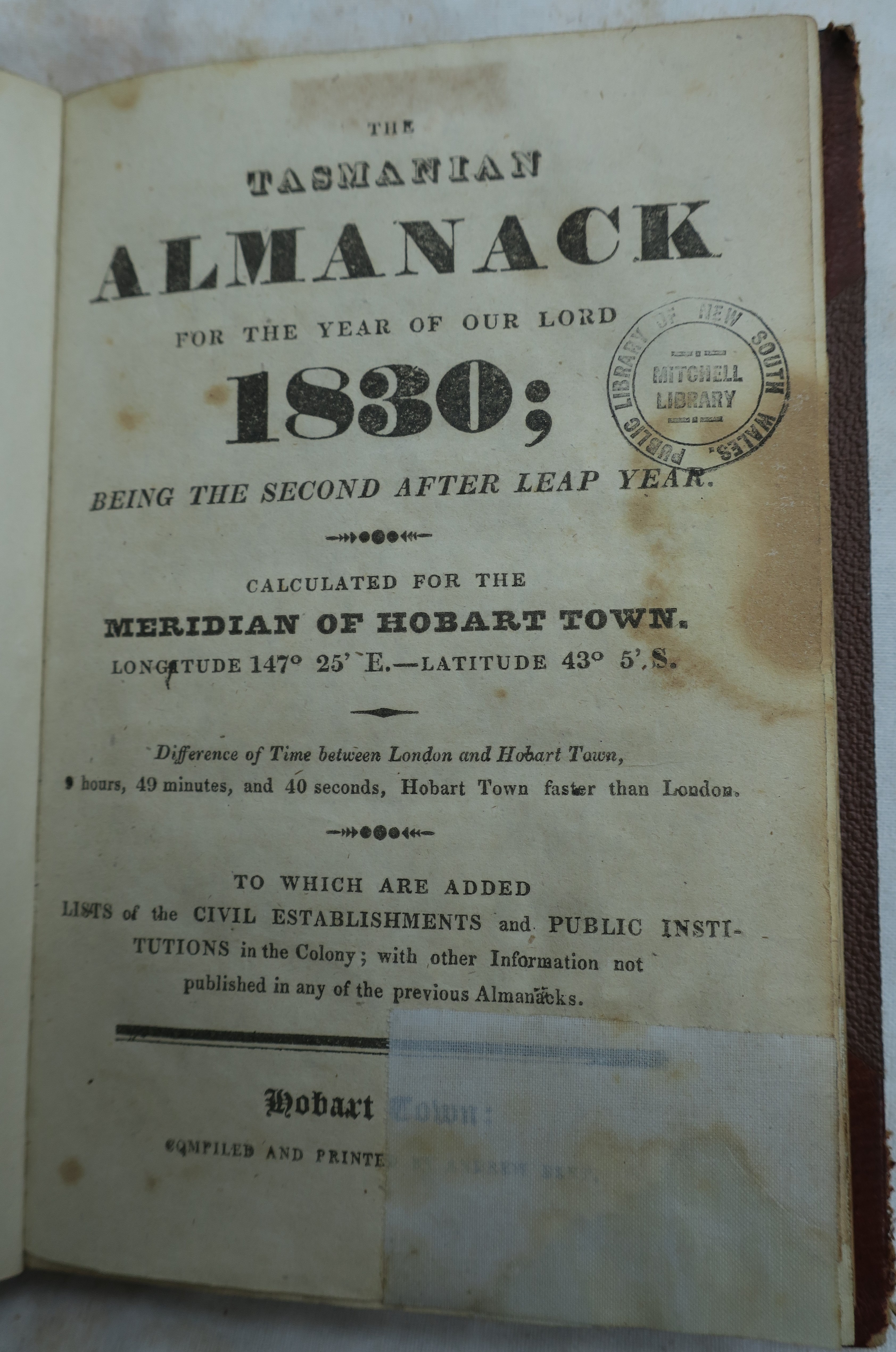 The Tasmanian Almanack for the Year of our Lord 1830; being the second after Leap Year. Calculated for the Meridian of Hobart Town, Longitude 147° 25′ E.—Latitude 43° 50’ S. Difference of Time between London and Hobart Town, 9 hours, 49 minutes, and 40 seconds, Hobart Town faster than London. To which are added Lists of the Civil and Military Establishments and Public Institutions in the Colony; with other Information not published in any of the previous Almanacks. Hobart Town: Compiled and printed by Andrew Bent.