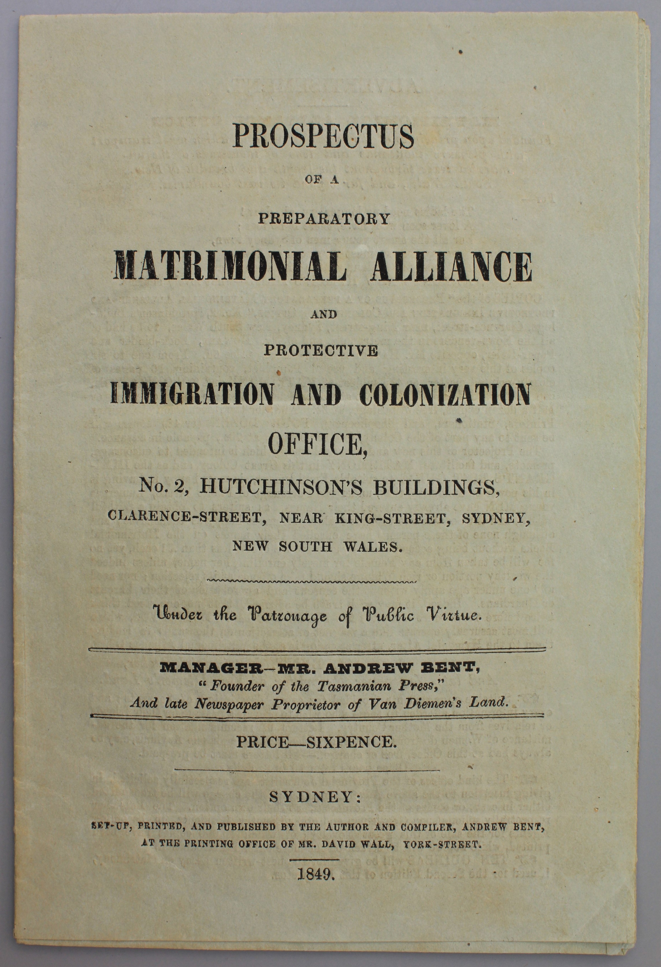 Prospectus of a Preparatory Matrimonial Alliance and Protective Immigration and Colonization Office, No. 2, Hutchinson’s Buildings, Clarence-Street, near King-Street, Sydney, New South Wales. Under Patronage of Public Virtue. Manager – Mr. Andrew Bent, “Founder of the Tasmanian Press,” and late Newspaper Proprietor of Van Diemen’s Land. Sydney: Set-up, printed, and published by the author and compiler, Andrew Bent, at the Printing Office of Mr. David Wall, York-street. 1849.