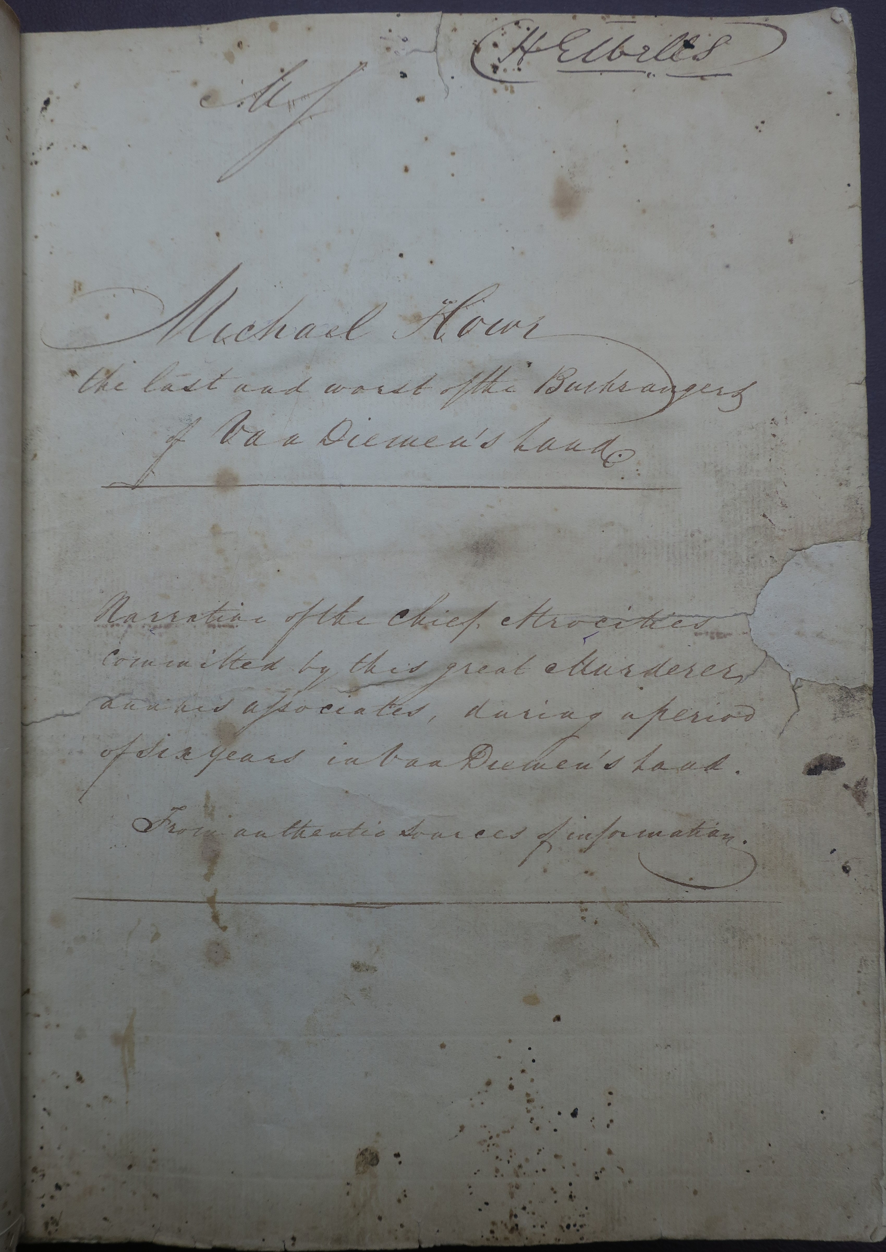 Michael Howe, the last and worst of the Bushrangers of Van Diemen’s Land. Narrative of the chief Atrocities committed by this great Murderer and his Associates, during a Period of six Years in Van Diemen’s Land. From authentic Sources of Information. Hobart Town: Printed by Andrew Bent. [no date, but 1819]