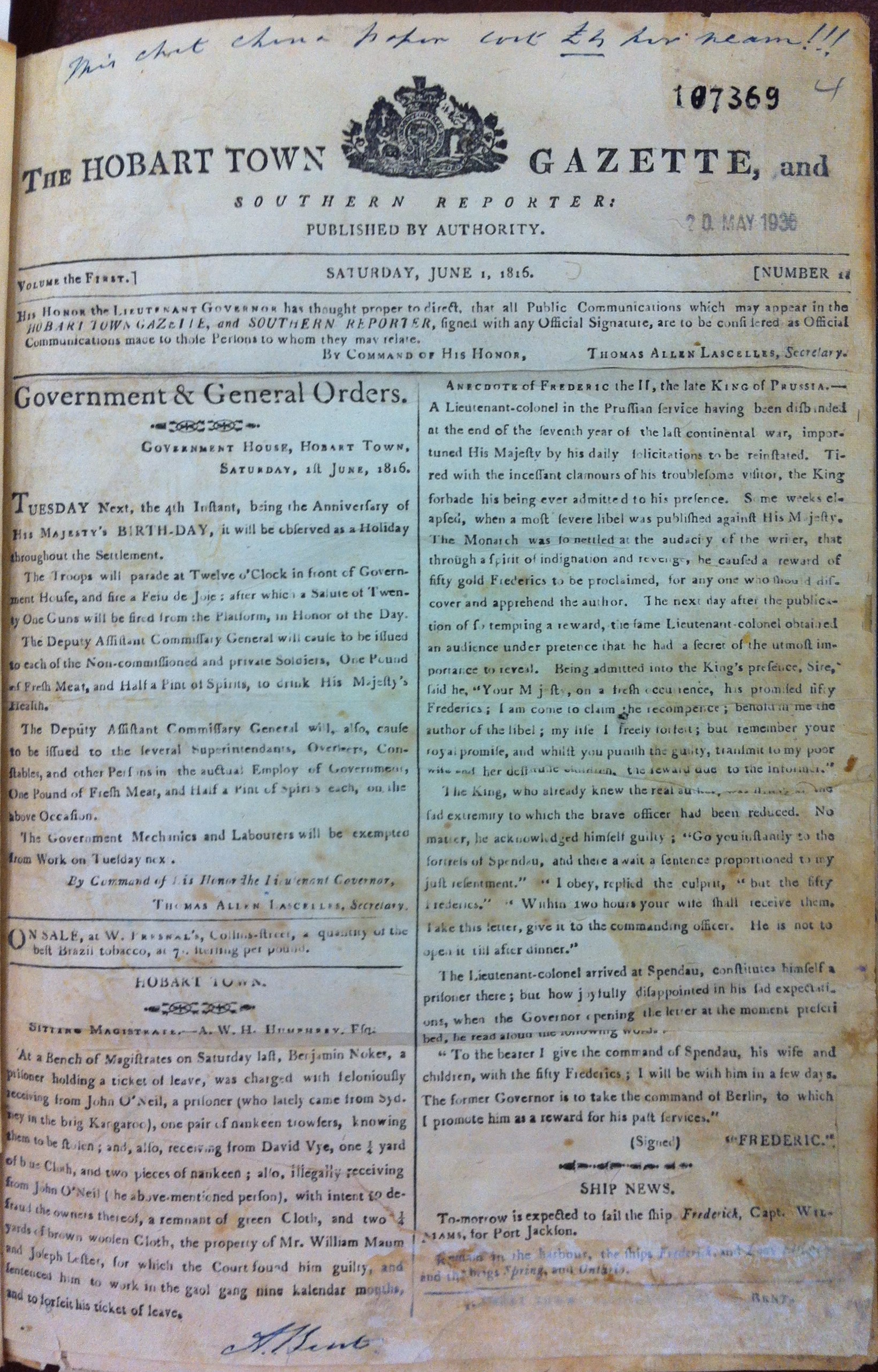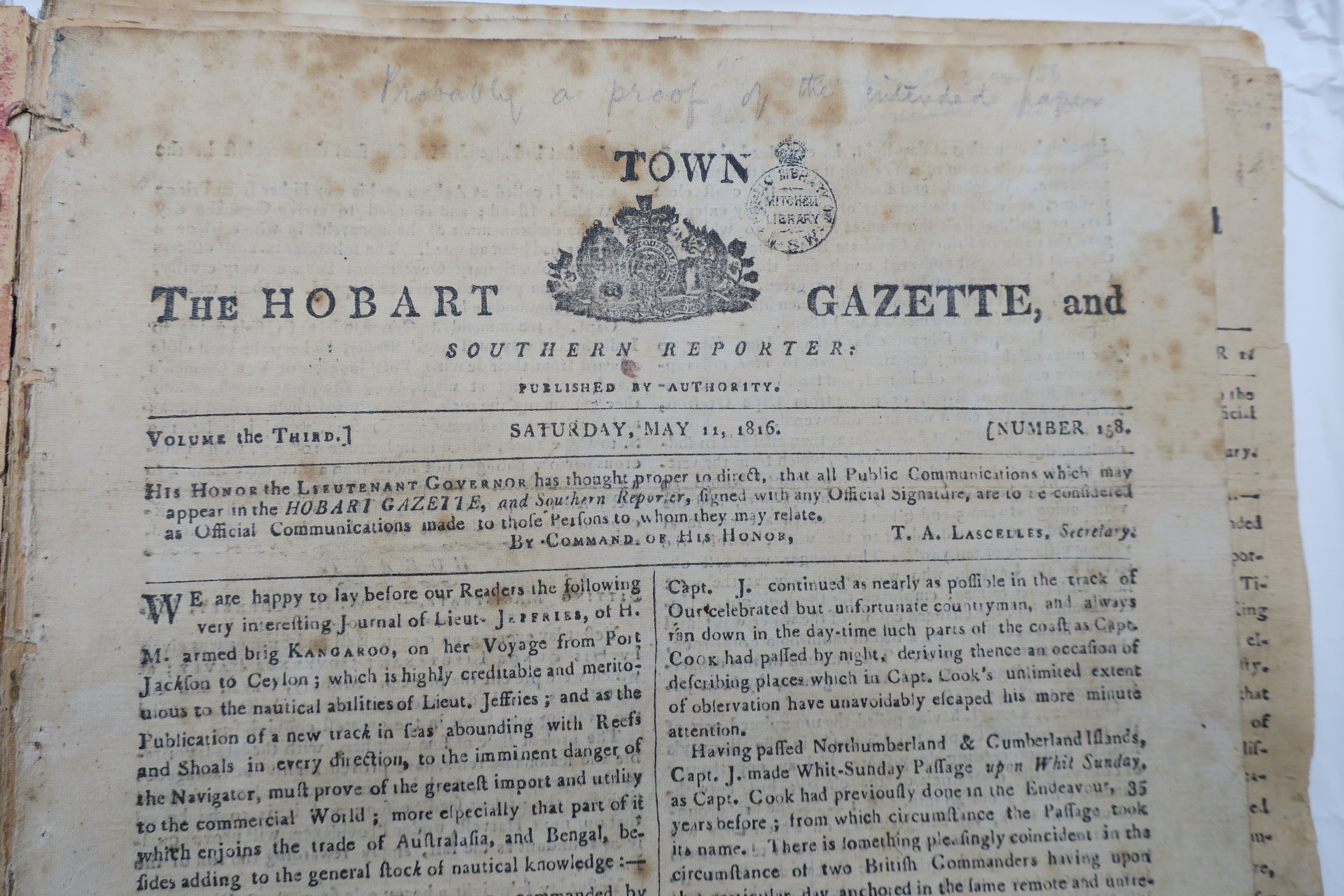 The Hobart Town Gazette, and Southern Reporter. Hobart Town: Printed by Andrew Bent.